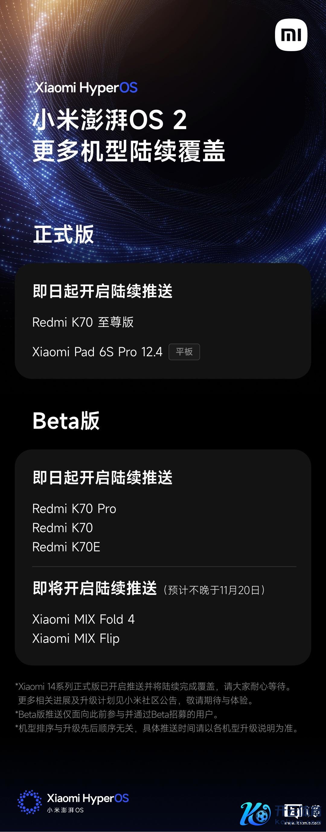 IT之家此前报说念,小米在 11 月 15 日公布了倾盆 OS 2 新一批升级权术,其中:Redmi K70 至尊版、Xiaomi Pad 6S Pro 12.4 平板已开启倾盆 OS 2 郑再版更新推送,K70 系列其他机型也已开启 Beta 版推送。
