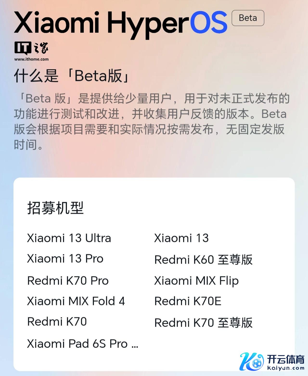 IT之家 11 月 21 日音讯, 13、Redmi K70 系列等超 10 款机型现开启倾盆 HyperOS 2 Beta 版内测招募,用户参与答题并最终得分 85 分以上(不含 85 分)即可通过。招募机型包括: