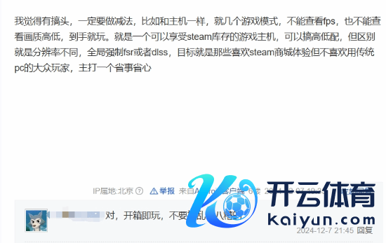 但并非扫数东谈主齐合手悲不雅观念。也有玩家提议,V社淌若能够简化主机功能,专注于提供浅薄、径直的Steam游戏体验,约略会眩惑一部分用户:“我合计有搞头,一定要作念减法,比如和主机不异,就几个游戏口头,不成检察FPS,也不成检察画质上下,得手就玩。即是一个不错享受Steam库存的游戏主机,不错搞上下配,但区别即是辞别率不同,全局强制FSR或者DLSS,办法即是那些可爱Steam商城体验但不可爱用传统PC的公共玩家,主打一个省事宽心。”
