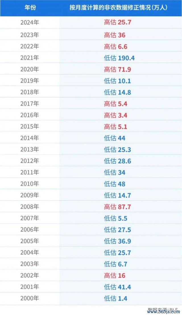 2000 年至 2024 年好意思国非农数据修正情况(数据起原:BLS)