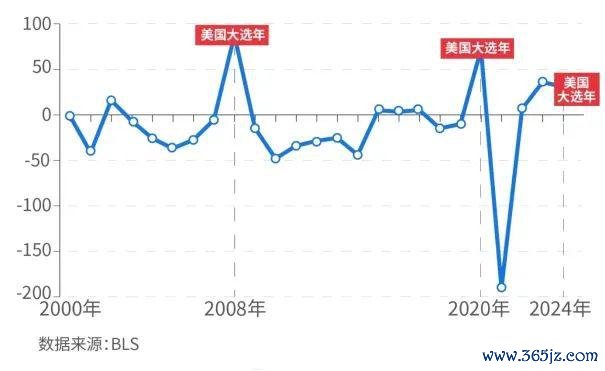 2000 年至 2024 年间,好意思国非农数据高估极值多发生在大选年(数据起原:BLS)