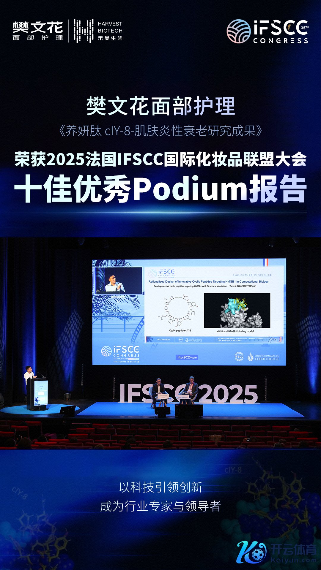 值得一提的是,就在不久前,樊文花刚在法国戛纳举办的第35届IFSCC(外西化妆品化学家学会定约)嘉会上,凭借“养妍肽cIY-8针对肌肤炎性软弱霸术落幕”入选大会十佳优秀Podium讲述。两次外洋认同印证樊文花科研实力的捏续冲破。
