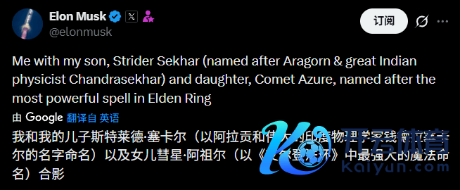 女儿的名字 Comet Azure 则饱和来自游戏领域。马斯克称,她的名字灵感源于《艾尔登法环》中最强力的法术之一——“彗星亚兹勒(Comet Azur)”。马斯克曾将《艾尔登法环》评为我方2022年的年度游戏。