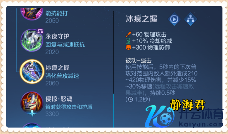 小结:淌若对面爆发才略不是特出高欧洲杯体育,你本身又属于短少硬扫尾手艺+比拟依赖强化普攻+对冷却缩减条目高的硬汉,那出冰痕之持就细目没错了。