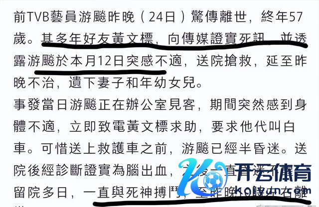 2 月 25日早上,经多方媒体证据,资深 TVB 绿叶演员游飚,在大年头八晚 10 点附近,因急性脑出血经 12 天抢救无效离世,长年 57 岁。
