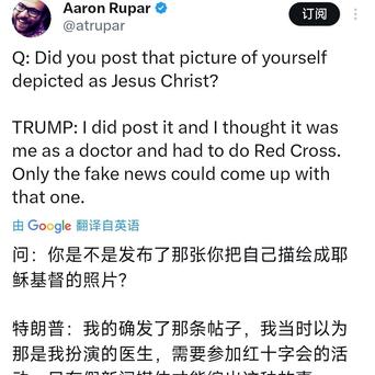 【晒耶稣形象照被问后,特朗普离谱抵赖:我饰演的是医师】记者:你是不是发布了那张你把我方形色成耶稣基督的相片?